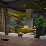 Door het toepassen van zachte, op elkaar afgestemde kleuren, natuurlijke materialen zoals eikenhout en marmer, en grote ramen die het groen van buiten naar binnen halen, ontstaat een ingetogen en serene setting. Het centrale blok met keuken, toiletten en uitgifte is volledig geïntegreerd in een eikenhouten wand, waardoor rust en eenheid ontstaat.