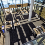 Waar gaat de eerste aandacht van een student naar toe?…. De bar. Dit is dan ook de receptiebalie van het hoofdkantoor van SSH& geworden. Studentenhuisvesting Nijmegen (e.o) hebben hun huidige kantoor behouden en er middels een ingrijpende verbouwing het kantoor een nieuwe impuls en dynamiek willen meegeven. De entree heeft een knipoog naar de studentenhuiskamer en de gebruikte afbeeldingen op verschillende wanden illustreren dit nog meer. Wi hebben dankbaar gebruik gemaakt van het logo en de kleurstelling en dit door het pand gebruikt. Van het logo is een dessin ontwikkeld wat op diverse plaatsen in het gebouw is terug te vinden. Als screening voor de vergaderkamers tot de decoractie op de bar. De felle kleuren hebben wij geconcentreerd om het trappenhuis midden van het pand . De kantoorvloer heeft een rustige warme uitstraling met veel aandacht voor groen en natuurlijke elementen. De lunchgelegenheid heeft ook een knipoog naar het cafe, met stamtafel, bar en treincoupe zitjes. Hierdoor wordt de ruimte ook uiten de lunch goed en intensief gebruikt. De uitstraling van deze locatie zal de blauwdruk zijn voor de andere (deel) kantoren in de stad.